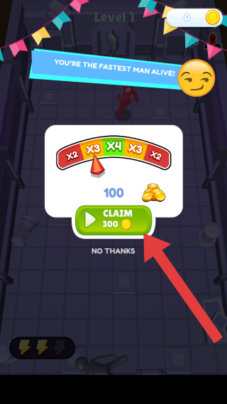 3、画面显示玩家完成第1关,获得“YOU'RETHEFASTESTMANALIVE!”(你是在世最快的人)评价,可点击【CLAIM300】领取300金币奖励,也可选“NOTHANKS”放弃。