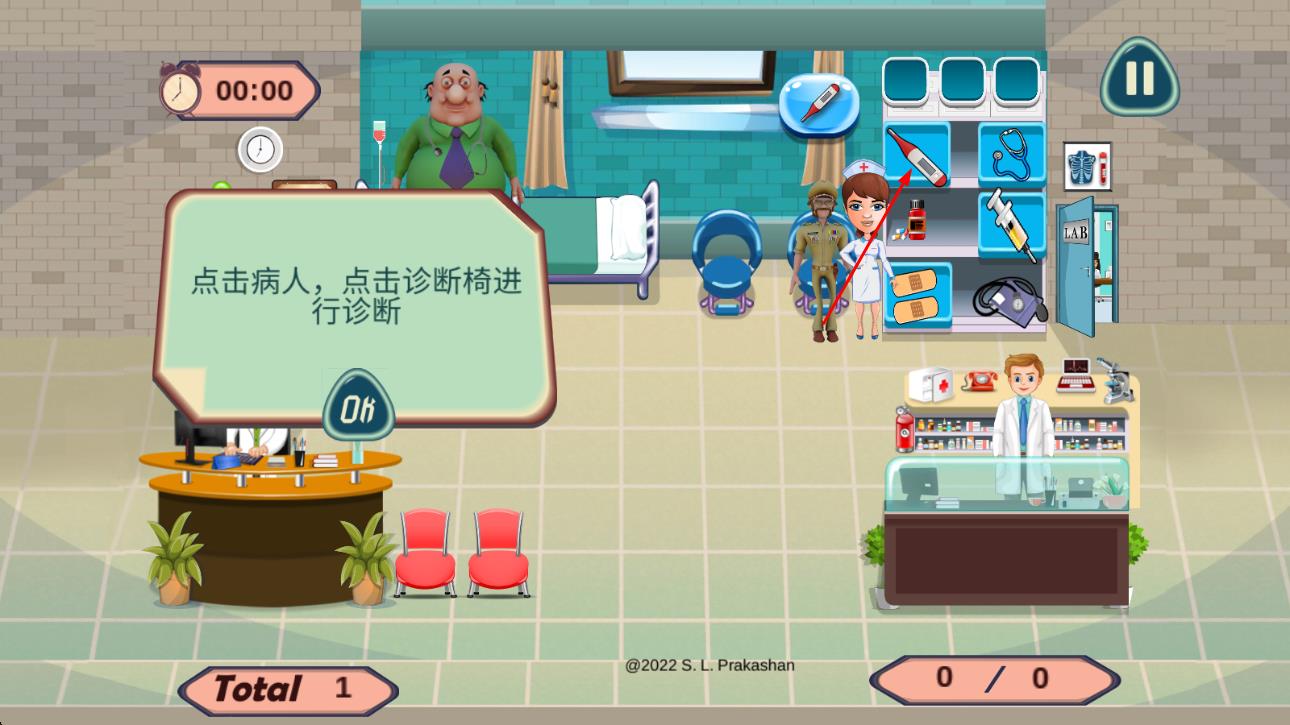 1、进入游戏后,在初始界面熟悉医院布局,接收首位患者并引导至对应诊室,使用基础设备完成初步诊断,开启医院运营。