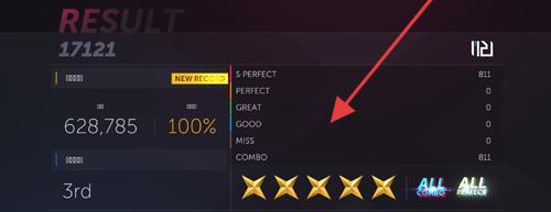 3、演奏结束后,查看【RESULT】界面数据,关注【S PERFECT】等判定数量,依据结果优化操作,冲击更高星级。