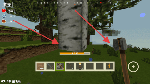 1、操控角色,用斧头砍伐树木(首图桦树 ),获取木材资源,界面下方显示背包物品(工具、材料 ),按需求收集。
