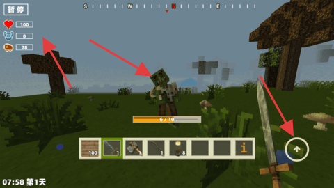 3、遭遇敌人(如第三张图僵尸 ),查看左上角生命值、饥饿值,用武器(剑 )战斗,通过操作按钮(移动、攻击 )生存,积累资源发展,完成生存挑战 。