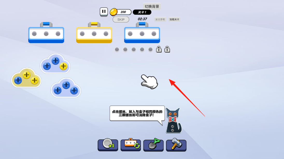 1、进入关卡1,依据界面提示,明确“点击螺丝,放入同色盒子凑3颗消盒”规则,开始操作,挑选对应颜色螺丝尝试。