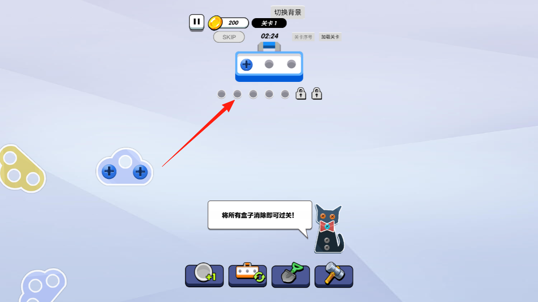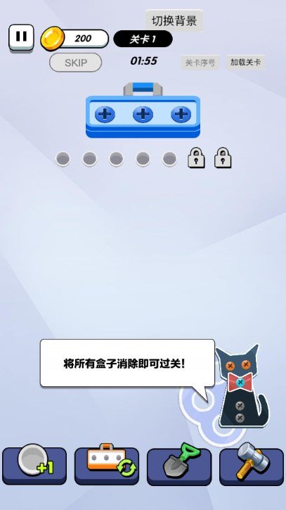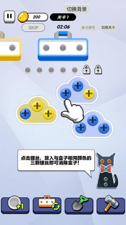 2、识别盒子颜色(如蓝色),选取同色螺丝,准确放入盒子空格,逐次凑齐三颗,消除所有盒子,达成关卡要求。