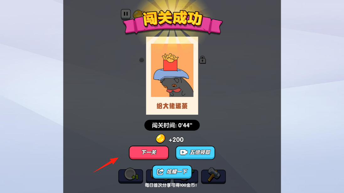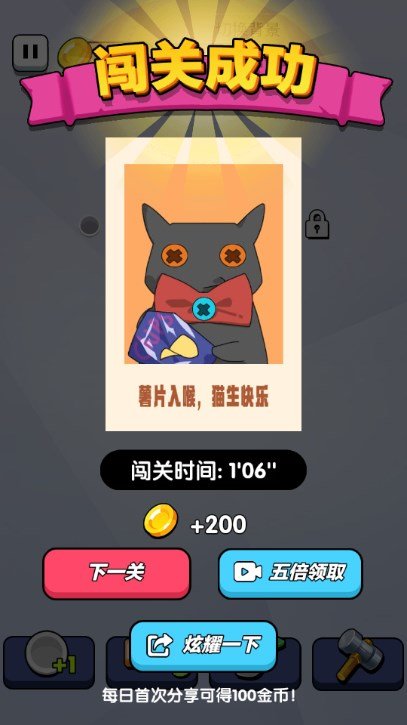 3、成功消除盒子后,在结算界面点击“下一关”继续挑战,也可选择领取奖励、分享炫耀闯关成绩,积累金币解锁道具。