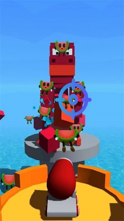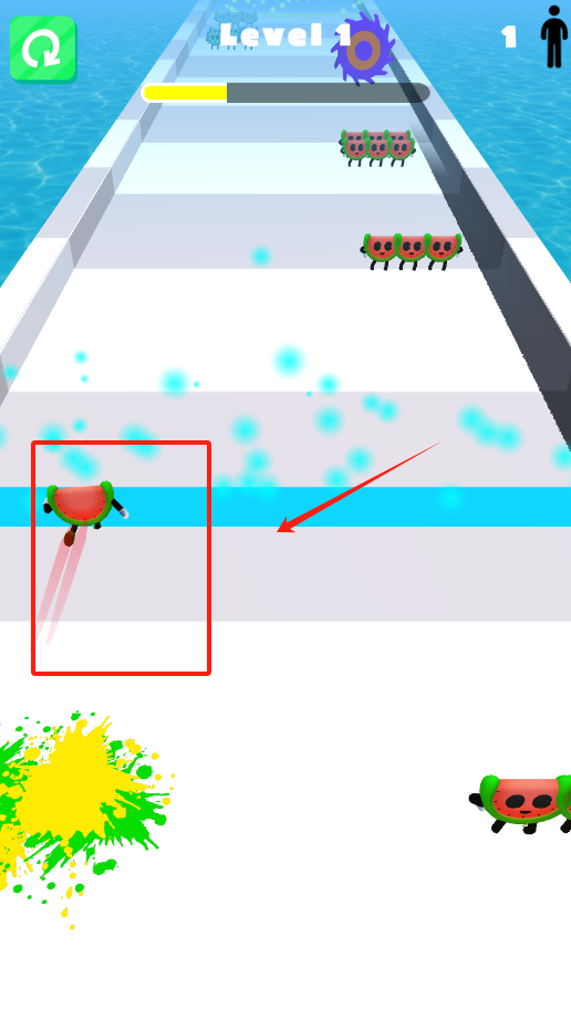 2、瞅准被红框圈住的西瓜怪,点击它就能发起攻击,击败后会溅出西瓜汁,继续前进。
