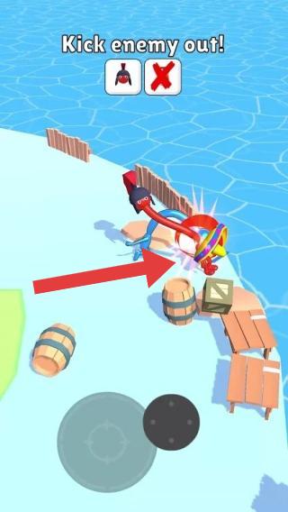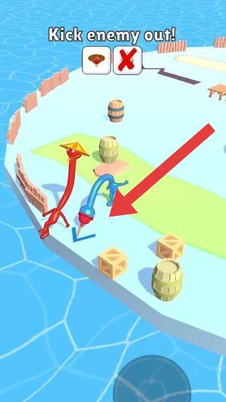 1、画面中有红色和蓝色的软体角色,上方文字“把敌人踢出去!”,界面有道具选择的图标,场景里还有木桶、箱子等物品,游戏玩法是操控角色将敌人踢出场地。