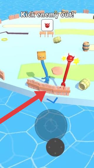 3、画面中有蓝色和红色的软体角色,蓝色角色戴着方块头,红色角色带有恶魔角装饰,周围有木桶、砖块围栏等场景道具,下方有操控按钮,玩法是操控角色将敌人踢出场地。