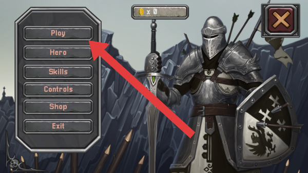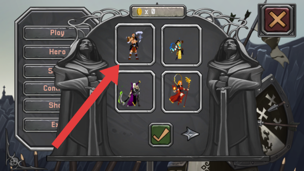 2、包括Play、Hero等选项,右侧可选择的英雄角色有4个,分别是持武器的近战风格角色、身着蓝黄服饰的角色、持紫色武器的角色、身着红袍的角色。