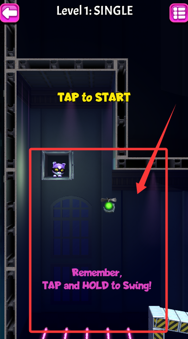 2、在关卡场景,依据提示点击并长按屏幕,让角色借助钩子摆动靠近目标位置。