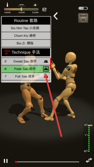 2、进入招式选择界面,点击“Paak-Sau拍手”等手法,切换演示内容,学习对应武术招式。