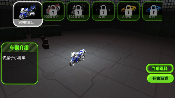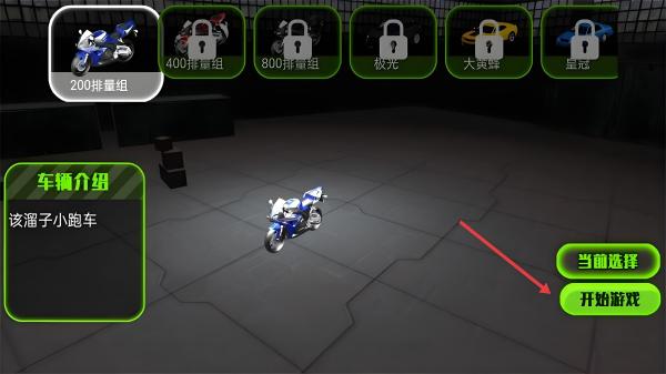 1、在车辆选择界面,选定【200排量组】蓝色摩托车,点击【开始游戏】,进入熔岩赛道挑战。