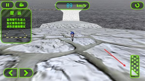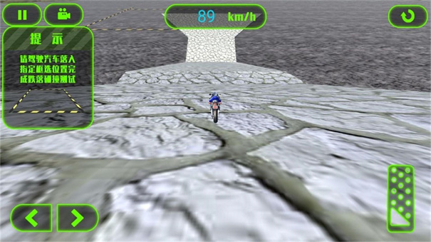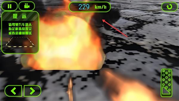 2、驾驶摩托遇火焰障碍,用左右按键控方向,按提示【请驾驶汽车落入指定碰撞位置完成跌落碰撞测试】冲过火焰区域。