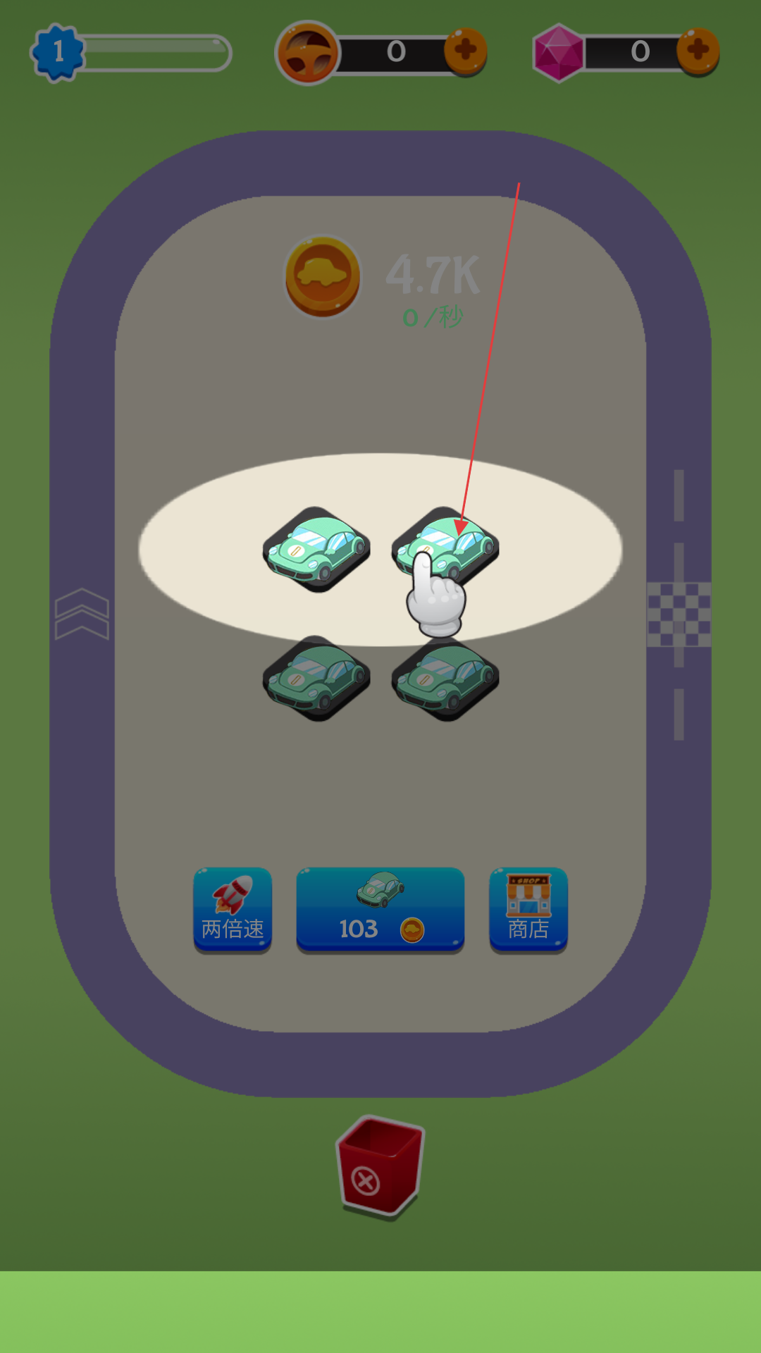 2、购买后,点击箭头指向的车辆位置,将相同车辆拖动合成,提升车辆等级,获取更高收益。