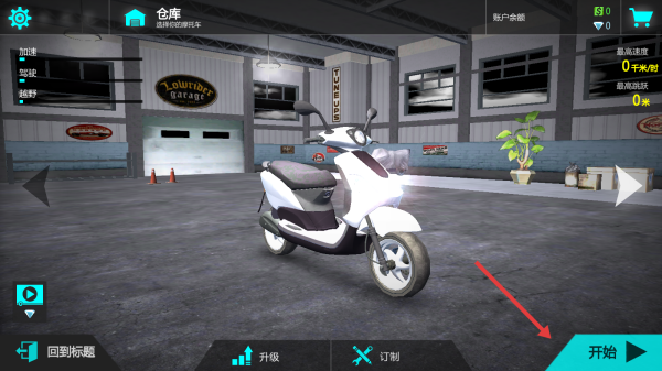 1、在仓库界面,选定白色电动车,点击右下角【开始】,进入模式选择环节,准备体验骑行。
