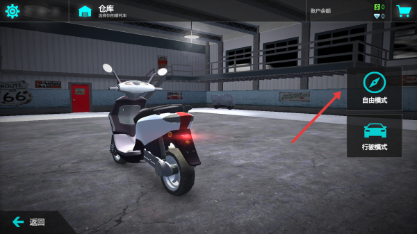 2、在模式选择页,选【自由模式】,切换场景至仓库,可无拘束操控电动车,熟悉骑行手感。