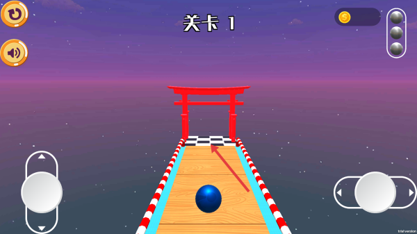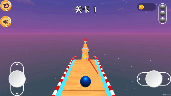 2、在【关卡1】场景,利用左右两侧虚拟按键,控制蓝色球球沿木质赛道滚动,瞄准路径上的金币,稳步向前推进。
