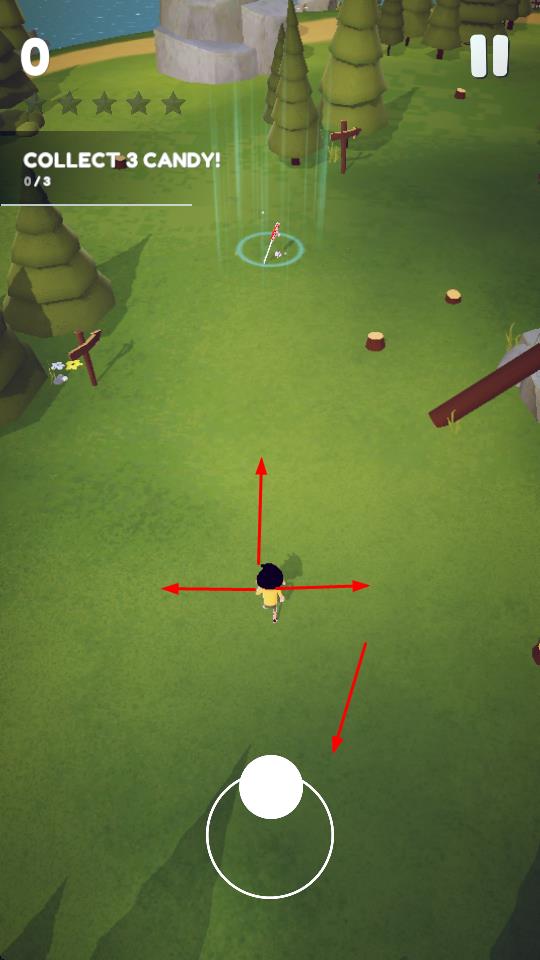 1、“任务挑战”,操控卡通小人,在森林场景完成任务:收集3颗糖果(CANDY)、摧毁5棵树(TREES)。
