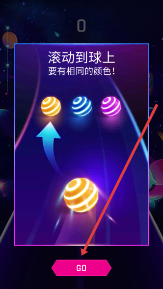 1、玩法引导页,阅读“滚动到球上要有相同的颜色!”,点击【GO】,开始音乐节奏游戏。