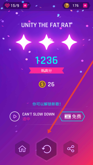 3、结算界面,查看“UNITY-THE-FAT-RAT”得分,点击中间按钮重玩,或解锁新歌、返回主页。