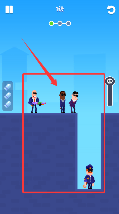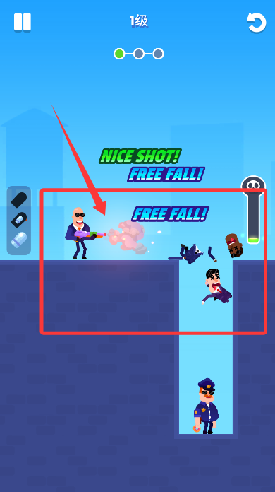 1、核心玩法要求玩家在有限子弹内消灭所有目标,通过拖拽瞄准确定射击角度和力度,精准计算弹道路径是成功的关键。