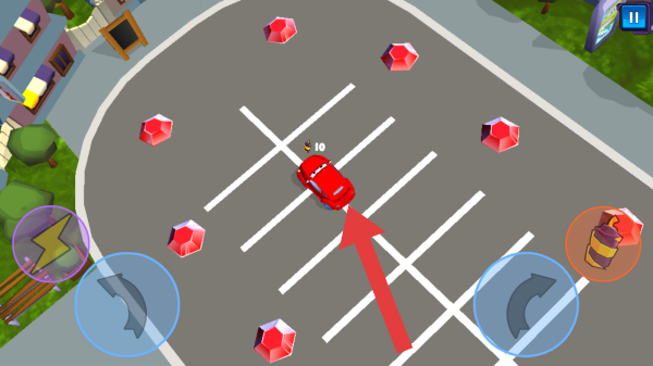 1、呈现了车辆在地图上收集道具、竞技的场景,红色汽车是玩家操控对象,周围有菱形道具,界面有技能和转向按键。