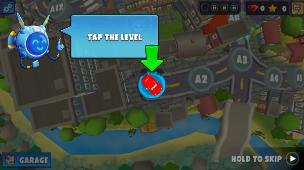 3、画面有机器人引导点击关卡(TAPTHELEVEL),展示了游戏地图、车辆及“A12”“A3”等区域标识,还有“GARAGE”(车库)和“HOLDTOSKIP”(长按跳过)。