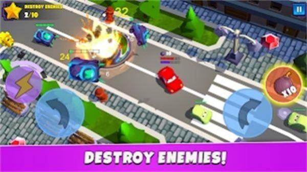1、汽车操控竞技:通过虚拟摇杆控制汽车移动,按键触发加速与刹车,在赛道中追逐对手或躲避攻击,展现了驾驶技巧。