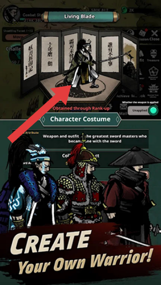 2、角色“LivingBlade”,获取途径通过rank-up获取,“CharacterCostume”(角色服饰),介绍文字(武器和装备:与剑合一的最伟大的剑术大师),还有不同造型的武士角色等。