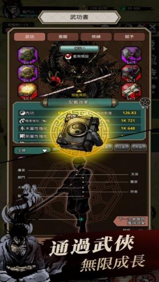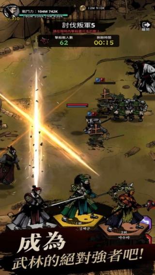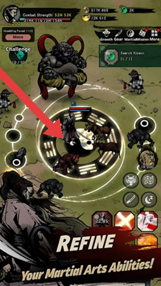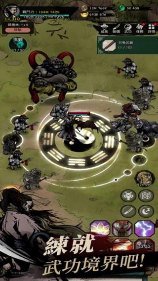 3、画面中有角色、怪物,下方文字“提升你的武术能力!”,还显示了挑战进度“19/50”、一些装备和数值信息。