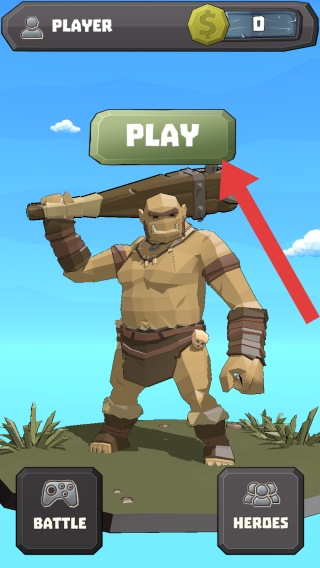 1、界面上方显示“PLAYER”(玩家)、金币数;点击【PLAY】按钮;下方有“BATTLE”、“HEROES”按钮,画面主体是一个手持巨棒的兽人形象,主要呈现基础功能按钮与角色展示。