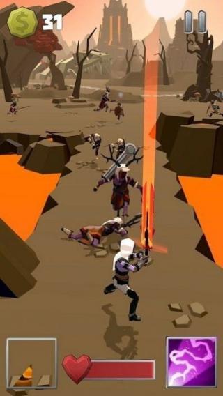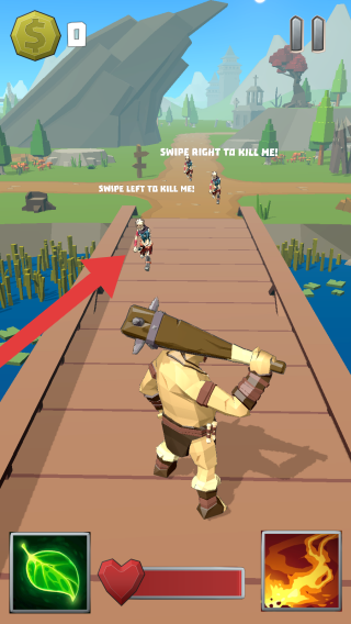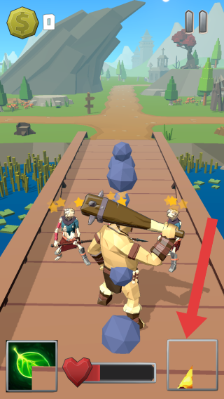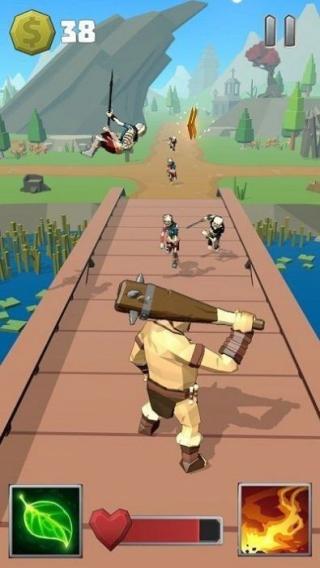 3、画面呈现战斗场景,有持巨棒的主角、两个敌方角色,界面元素包含金币、暂停按钮,技能栏有绿叶图标、黄色火焰技能,是动作战斗类的战斗过程画面。