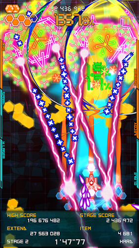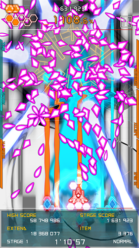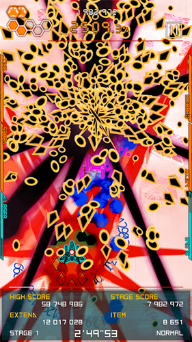 3、战斗中,操控角色躲避密集弹幕(如彩色几何弹幕),收集道具,争取高分(623),通关Stage1解锁后续。