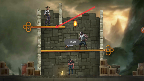 2、解谜关卡:观察角色、敌人位置,按箭头提示拔插销(先开上层),让英雄安全通过,击败敌人。