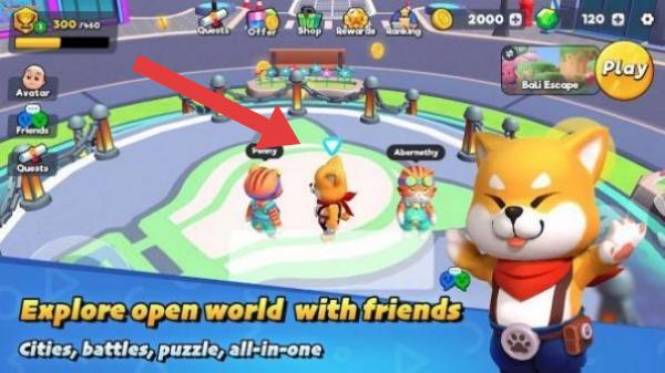 2、画面中显示了游戏内的开放世界场景,有多个卡通角色,上方有金币数量(2000)、钻石数量(120)等资源显示。