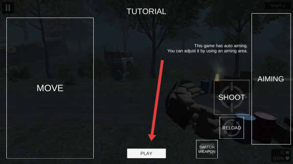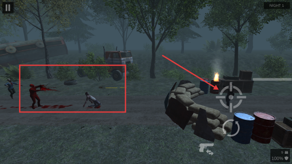 3、战斗时,瞄准箭头指向的僵尸,利用自动瞄准,点击射击,守护藏身处,完成“NIGHT-1”生存挑战。