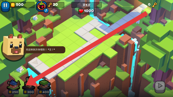 1、等待游戏加载完成,进入方块塔防世界,熟悉界面资源(500金币、20钥匙)与功能按钮。