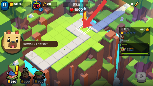 3、根据提示“邪恶块块来了!召唤弓箭手”,消耗对应金币,在箭头指引的空地放置弓箭手,抵御敌人保护核心。