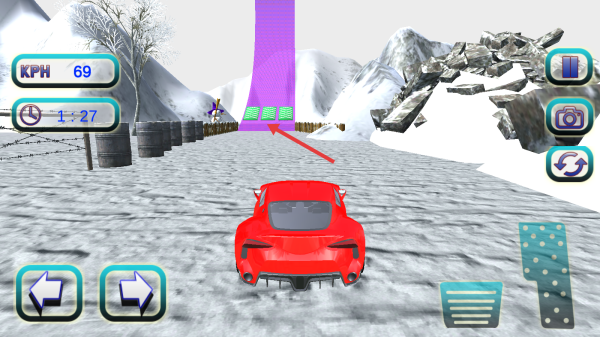 3、驾驶时,用方向按键控车,冲向紫色坡道,完成空中特技,避障碍、稳行驶,通过关卡。