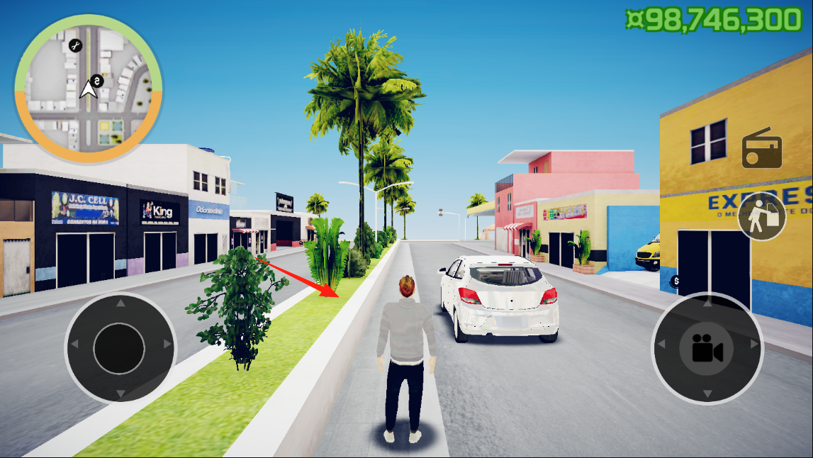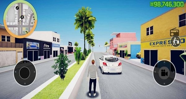 3、进入开放街道场景,操控虚拟摇杆移动角色,可探索街道、与车辆互动,借摇杆控制机制,在城市环境中自由行动,体验开放世界玩法的探索性,感受模拟生活的沉浸感。