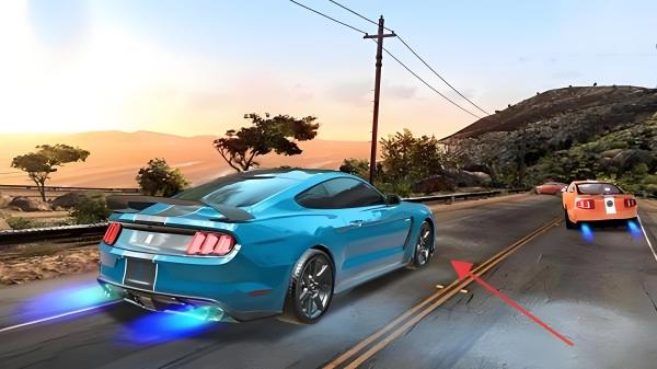 1、操控蓝色跑车,在郊野公路场景,利用尾焰加速,灵活过弯道,紧盯橙色目标车进行追击。