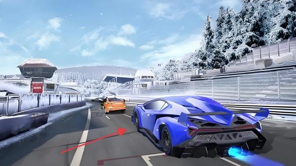2、驾驶蓝色超跑,于雪地赛道场景,注意路面易打滑情况,借助尾焰提速,尝试超越前方橙色车辆。