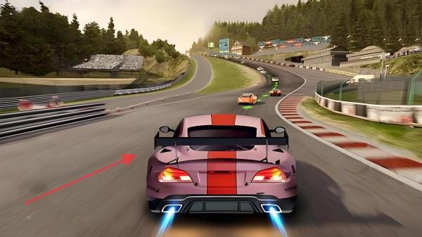 3、驾驭粉红斑纹赛车,在环山赛道场景,灵活操控过弯,依靠尾焰加速,持续追击前方多辆车辆。