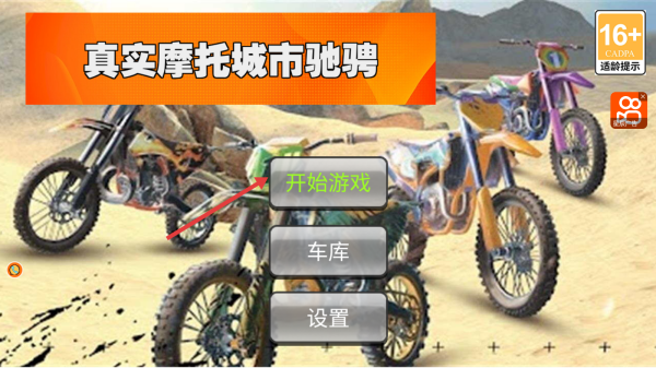 1、点击主界面【开始游戏】,进入《真实摩托城市驰骋》,选定摩托,开启城市骑行挑战。