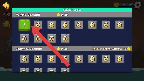 2、关卡进度:“NewbieCombat!”分组下第1关可玩(绿色高亮),其余关卡锁定;“NewbieCombat!”和“BeginnerCombat!”,分组解锁需总星星数。