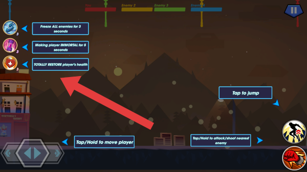 3、敌人标识:“Enemy2”“Enemy1”“Enemy”及对应血条颜色,还有暂停按钮、技能图标、移动控制按钮等。