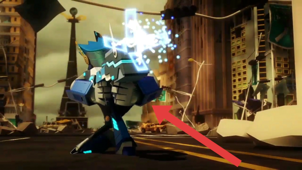 1、出现一个具有机甲风格的角色,角色身上有蓝色、黑色等配色,正施展带有蓝色光效的技能,背景是遭受破坏的城市环境,有建筑残骸、路灯等元素。