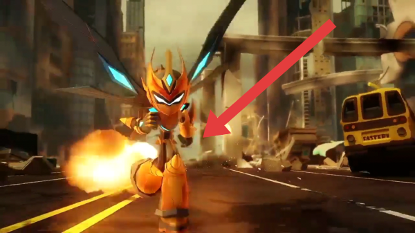 2、展示了一个橙黄色为主色调、带有蓝色光效装饰的机甲风格角色,角色身后有火焰特效,背景是被破坏的城市,能看到建筑残骸和一辆黄色的车。