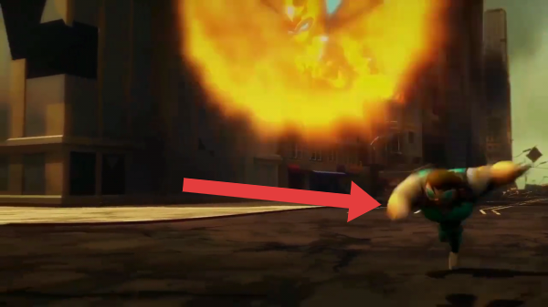 3、展示了一个角色,角色身着绿色衣物,背景是被破坏的城市场景,后方有巨大的火焰特效。