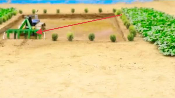 3、布置场景,将做好的农机模型放入沙盘农田,搭配作物、灌溉设施,还原农业生产环境。