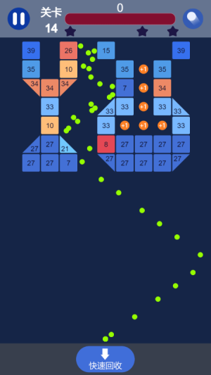 4、游戏中的特殊道具各具特色,"震碎"道具可瞬间清除大面积砖块,"加球"道具能扩充弹珠数量,"加线"道具则能拓展攻击范围,合理搭配使用是制胜关键。